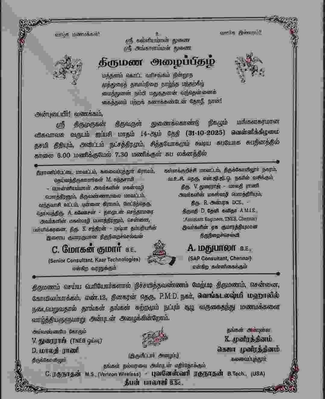 Muhurtham : 6.00 to 7.30 am IST Venue : Venkatalakshmi Mahal , Kovilambakkam